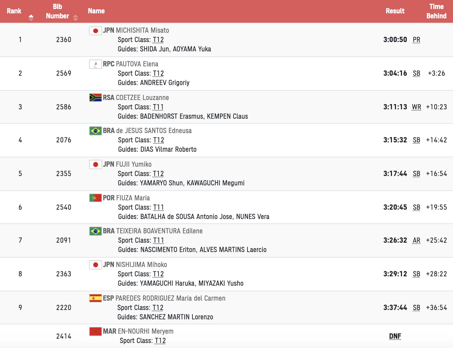 最大的亮點是 T12 女子馬拉松。世界紀錄保持者、日本的道下美里是 2016 里約帕運銀牌得主,是比賽前段四人領先集團的其中一員。俄國的 Elena Pautova 微微領先,直到 30 公里後,道下採取行動衝出,最後以 3:00:50 摘金,刷新了帕運紀錄!Pautova 以 3:04:16 保住了銀牌位置,而南非的 Louzanne Coetzee 以 3:11:13 摘銅。