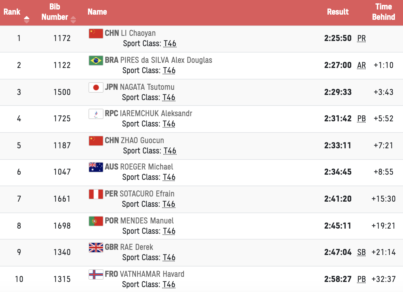 中國選手 李朝燕 在男子馬拉松 T46 級衛冕金牌,並以 2:25:50 的成績打破帕運紀錄。在前半場的 3 人領先集團中,除了李朝燕,還有日本 永田務 和澳洲的 Michael Roeger,約到一半距離時李加速,在 25 公里配速每公里加快5秒,30 公里配速又在加快 5秒,最後獨自衝線!