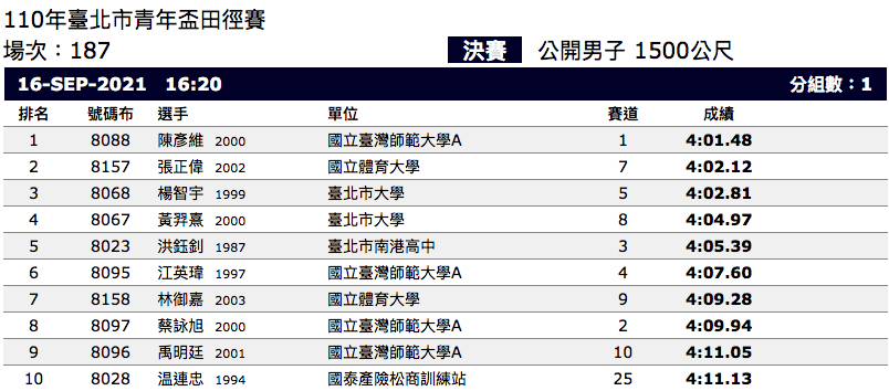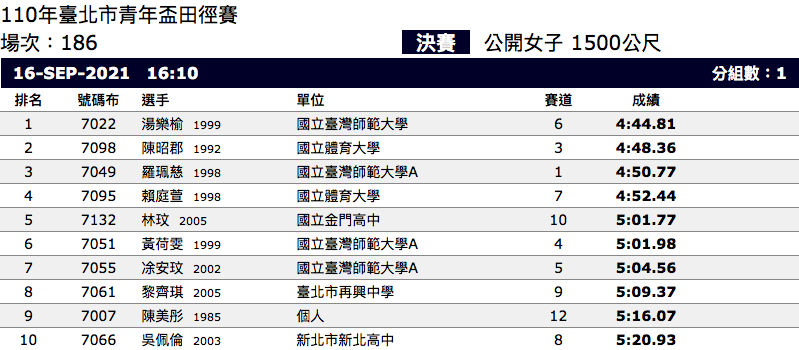 (成績來源:110年臺北市青年盃田徑賽)