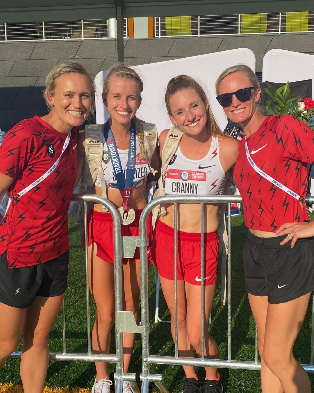Shalane Flanagan(右一)在 Bowerman Track Club 擔任教練。這次身為 BTC 成員的 Elise Cranny(右二)、Karissa Schweizer(左二)更入選為美國女子五千的奧運代表隊