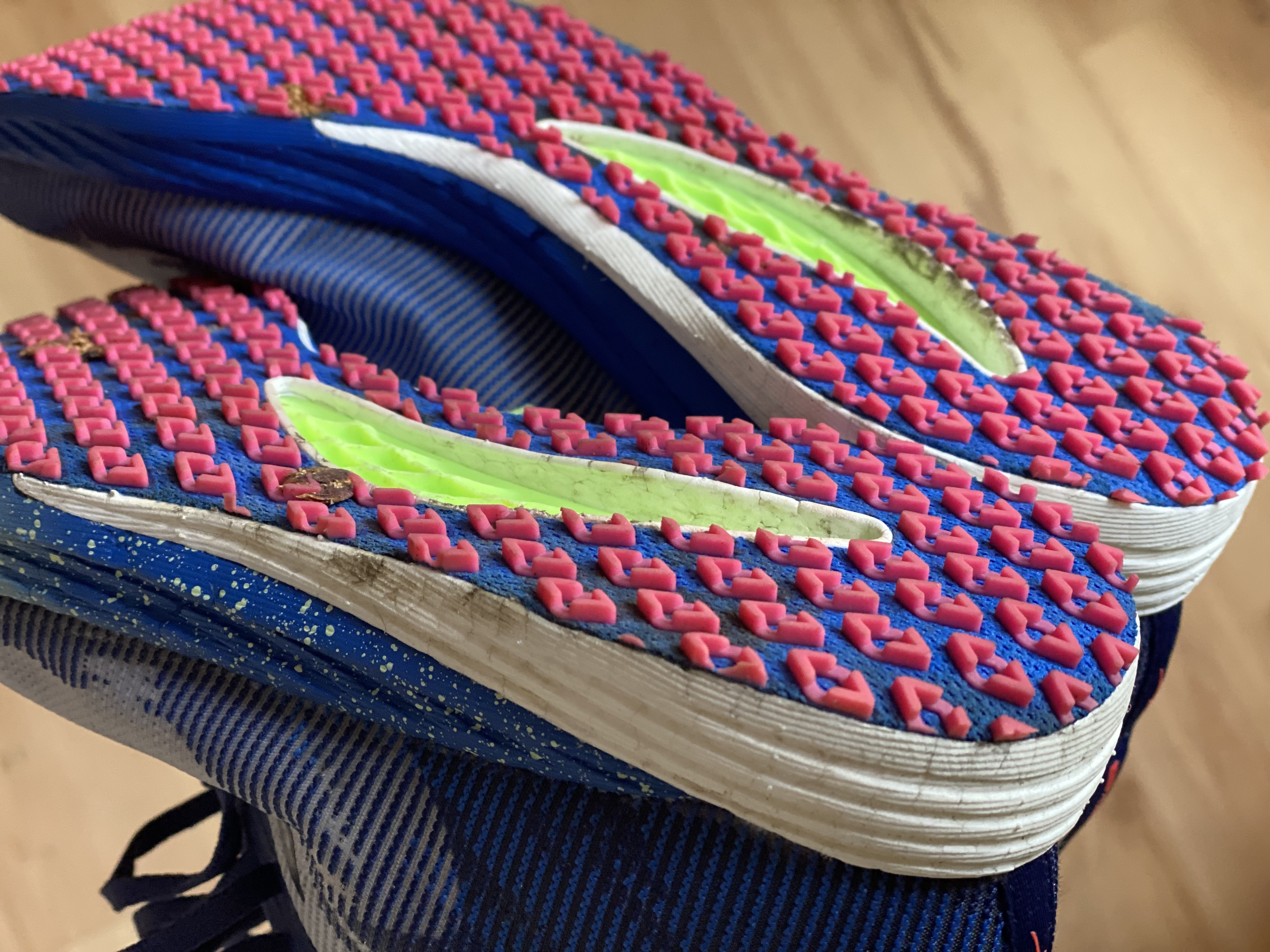 在跑過 100k 後,原本對 G3 大底全顆粒不是很有信心能撐太久,但結果令人意外,只有右腳外側掉了兩三顆,倒是因為個人腳刀跑法,中底外側的漆反而被磨掉了一些,粗略估計如果是一般落腳方式,全部都用來競賽、高強度,大概前 200k 能維持 90% 以上的性能(大抵的完整性、中底彈性和緩震度),500k 大概就是維持可跑性的極限,以一雙競賽鞋來說是可以比上不少場地賽、路跑。