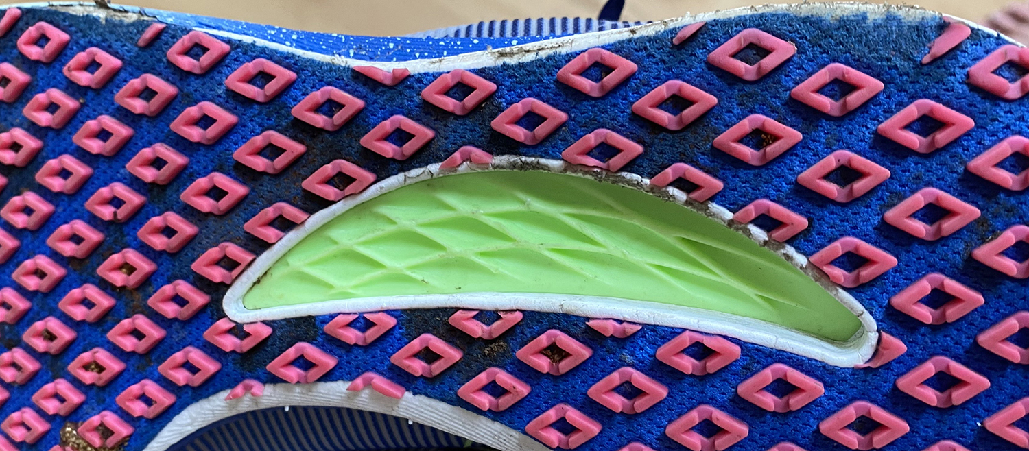 再來是某次練跑陪老婆準備全運會,先在陽交大校園上下起伏地形繞,計畫是先輕鬆跑半小時加上田徑場 150m 加速跑;輕鬆跑從 4:50 跑道 4:00/k,發現下坡有,由於我腳刀的著地角度、力道方向,加上顆粒大底在持續加溫下,腳底會有灼熱感,按照經驗持續跑會起水泡;田徑場的 150m 加速跑順利從 3:00/k 加到 2:30/k,每趟時間介於 24-26 秒,ENERZY 中底的回饋、保護加上 G3 的優異抓地力, 速度感媲美釘鞋,由於跑的時間短,沒有鞋底加溫起水泡的風險。