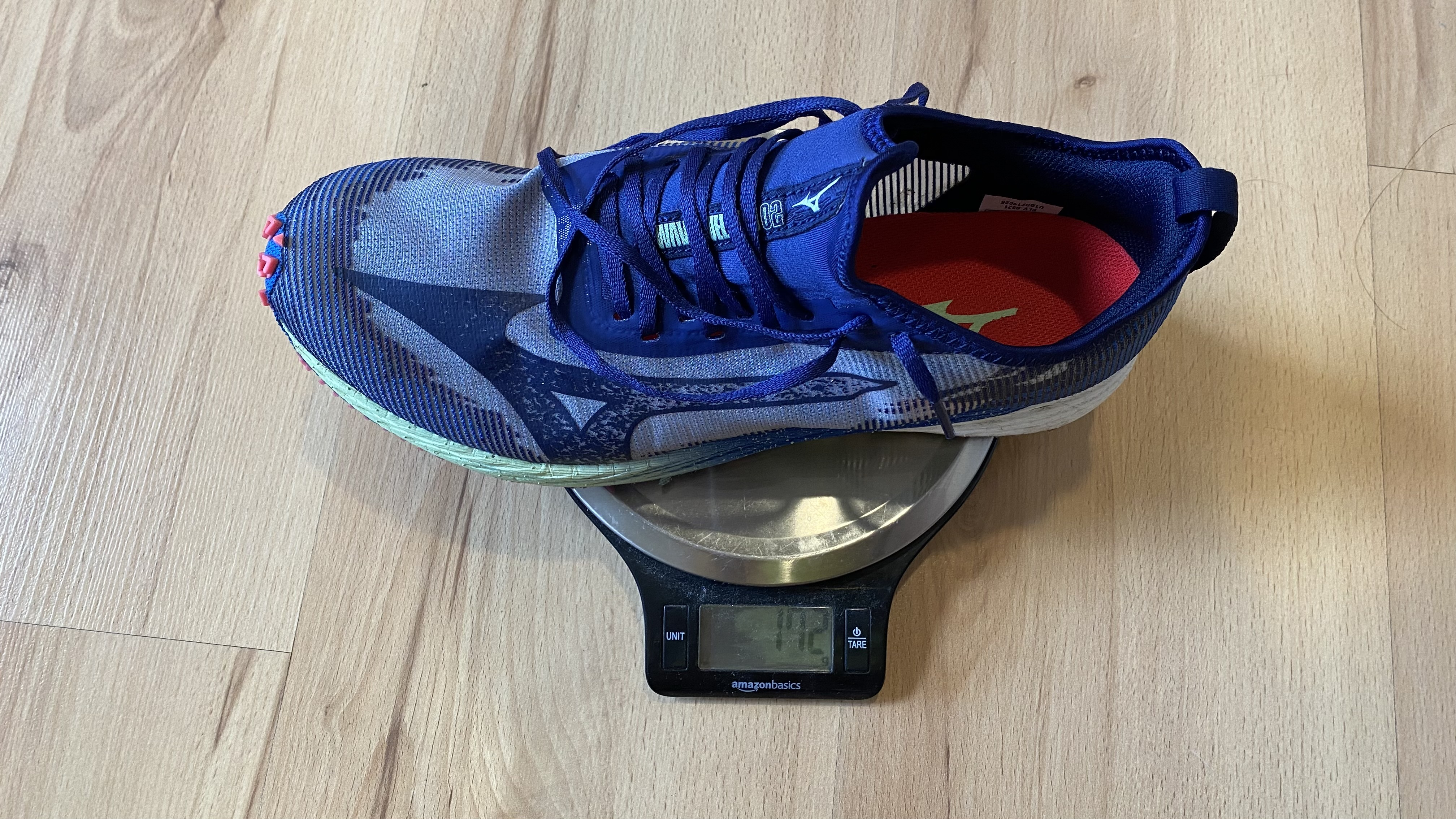 27.5cm 的 WAVE DUEL NEO 2 單腳重 172g,比起傳統 MIZUNO 薄底超輕量款式重 10-30g,畢竟為了在厚底世代加強一點保護效果,勢必要增加一點重量,不過比起他牌超級跑鞋約 190-250g,相對還算輕量。