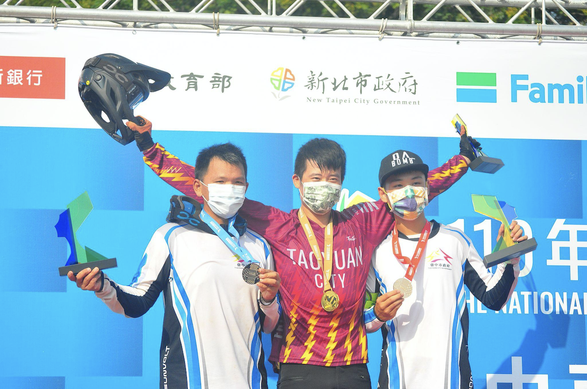 江思翰(左)、江勝山(中)、林宥榆(右)男子組下坡賽頒獎。攝影 /蔡郁玟