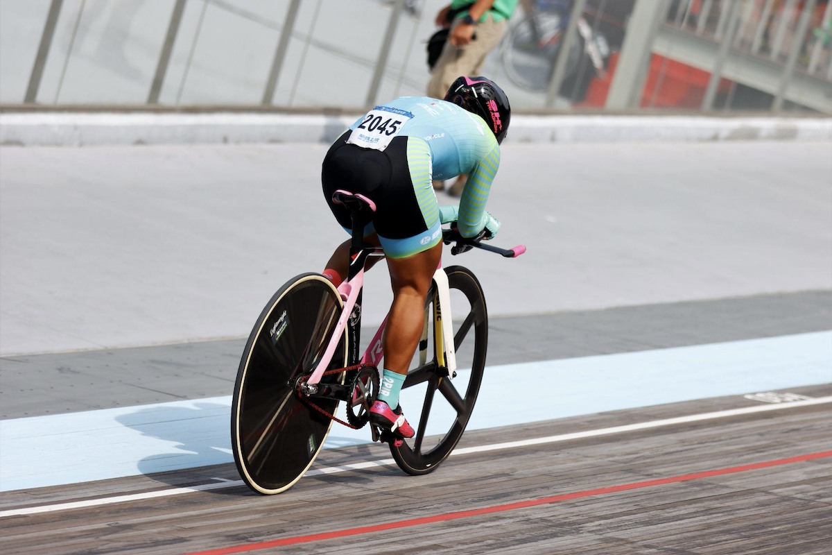 黃亭茵個人追逐賽破大會紀錄。攝影/巫妍潔 兩年來的身體傷害反增不減,卻讓黃亭茵的心理狀況調整許多,原本的舊傷再加上頸椎跟胸椎的傷害,在九月的公路賽甚至邊流眼淚邊騎,黃亭茵說:「當下真的是用意志力再撐的。」選手照著訓練計畫進行訓練,最重要的就是自己的心態調整,黃亭茵也坦言漸漸接受自己的身體狀況,黃亭茵說:「意志力是運動員最重要的堅持。」