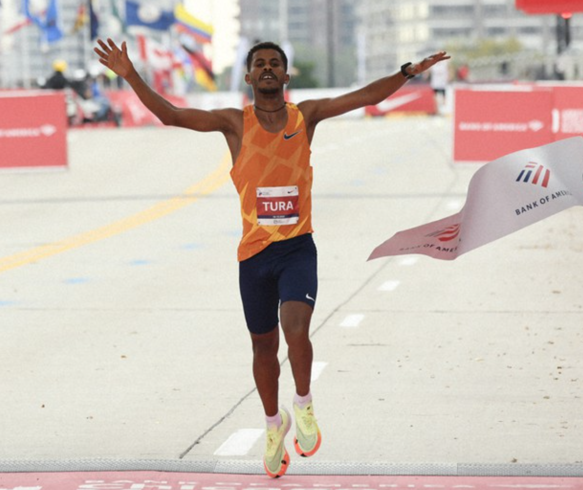 頻頻回頭確認情況後,Tura 最後階段咬牙發力跑回終點,以 2:06:12、23 秒之差獲勝!繼 Guye Adola 在柏林和 Sisay Lemma 在倫敦奪冠,連續第三位在世界馬拉松大滿貫奪魁的衣索匹亞男子選手!三人皆是首度拿下大滿貫賽事冠軍。