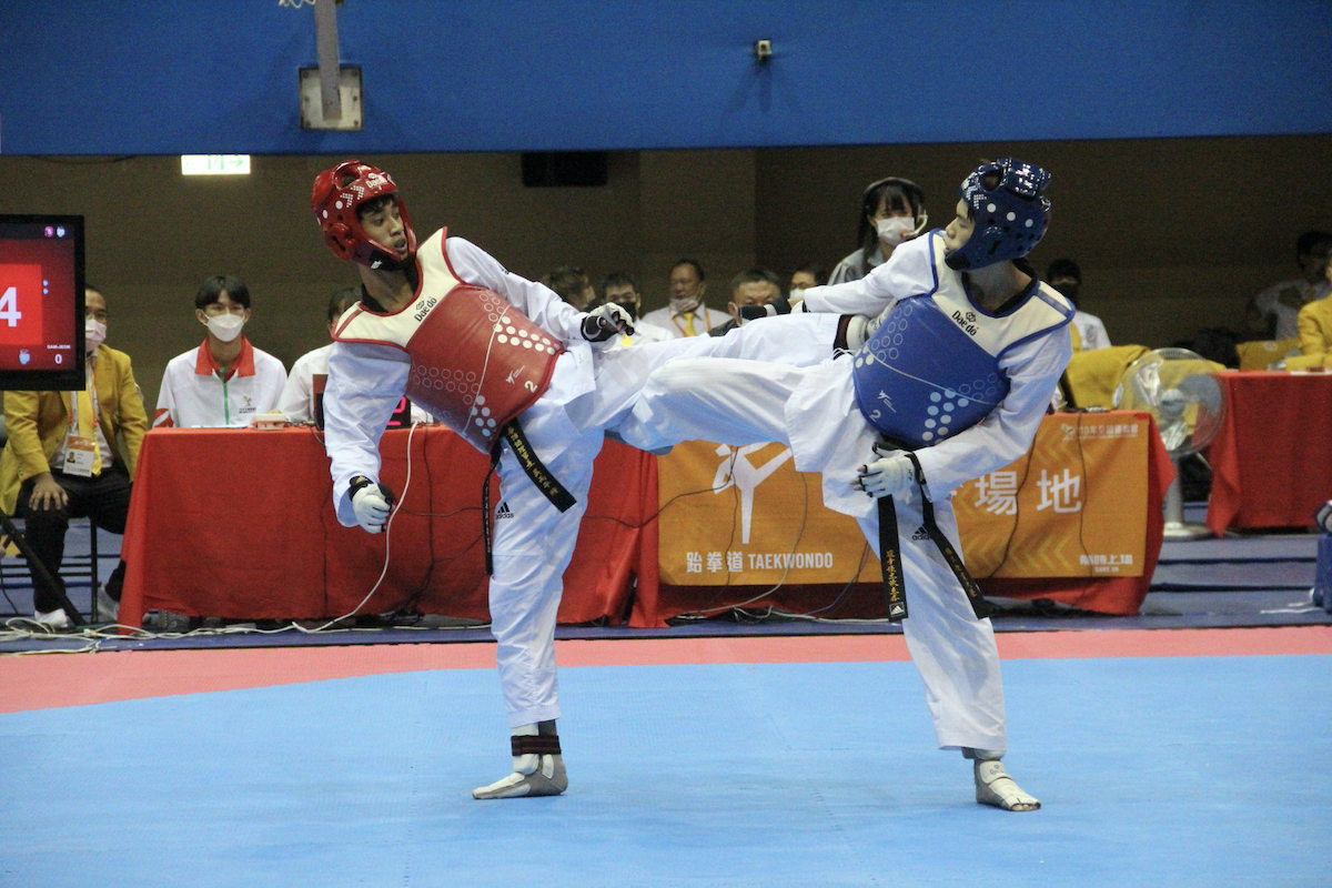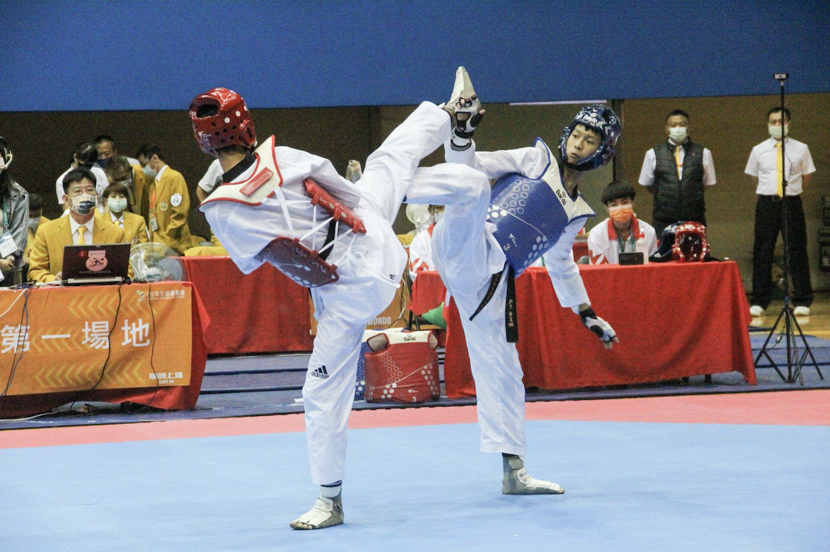 110年全國運動會跆拳道對打賽程,昨(17)日於板樹體育館開打。男子 58 公斤級金牌戰,新北市黃昱翔強忍腳傷,使出全力,擊敗對手苗栗縣陳鵬仁,最終以 11:7 奪下金牌。