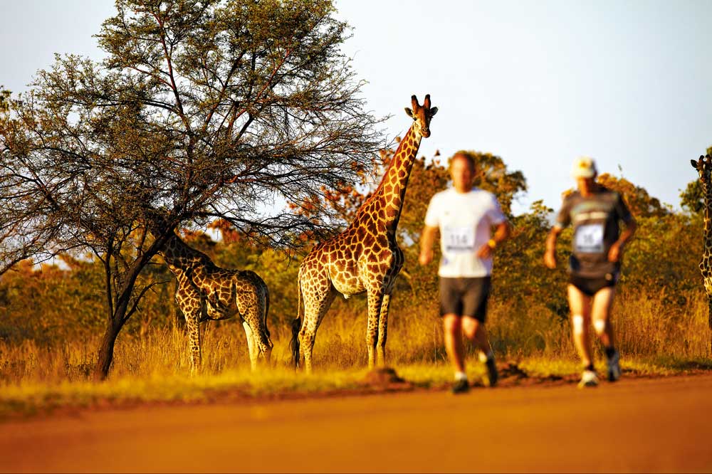 這是大五馬拉松--非洲最「荒野」的馬拉松所提供的承諾。既然號稱「大五」,參加這項在自然保護區 舉行的路跑,真的可以看到非洲人氣最高的五種動物,觀光客去非洲旅遊時都想拍牠們的照片。為了路跑時的安全,反盜獵警衛保證獅子會待在離跑者夠遠的地方。這樣就比較放心了,因為誰想當叢林之王的午餐?