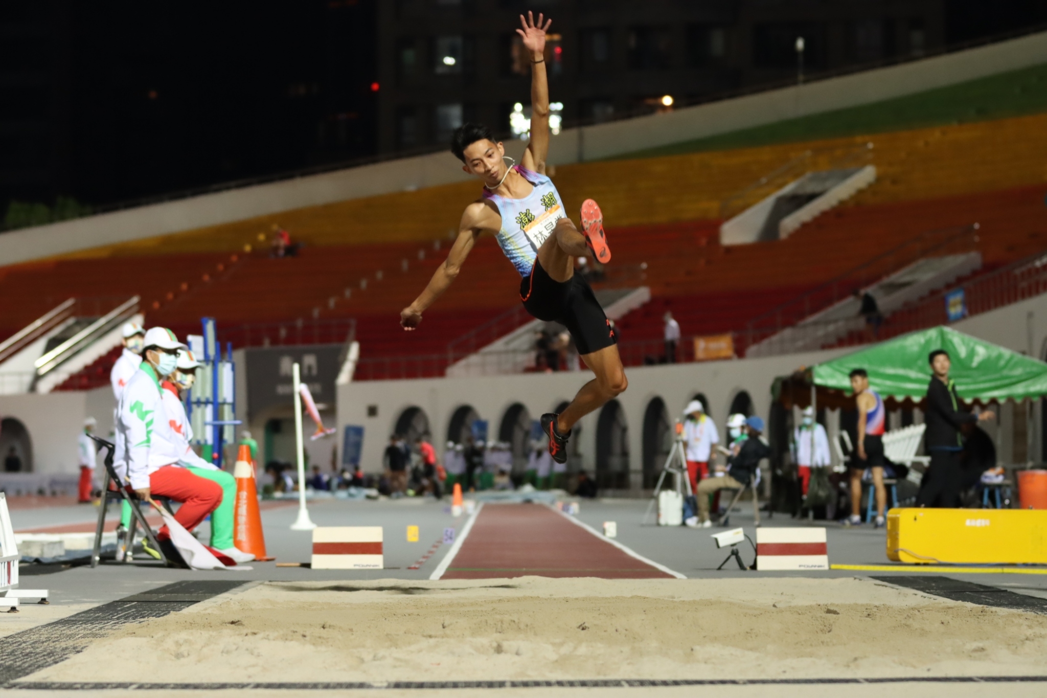 澎湖縣跳遠好手林昱堂,今狀態極佳,第二跳跳出 7 公尺 99 的驚人成績,可惜現場風勢較大,因順風 +2.1 導致成績不予記錄,但第五跳他奮力跳出 7 公尺 95,改寫大會紀錄。