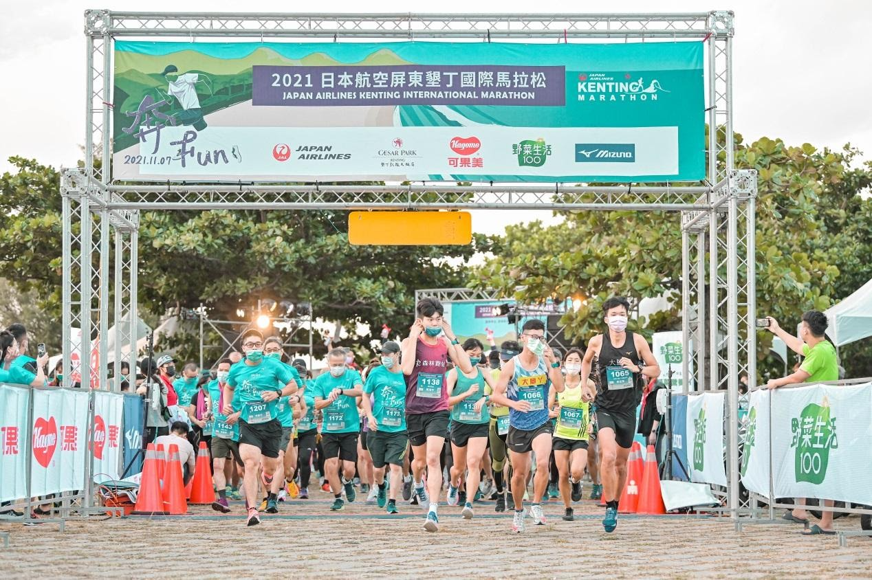 由屏東縣政府、屏東縣觀光協會、日本航空、墾丁凱撒飯店、和 LAVA 台灣鐵人公司聯手打造的「2021日本航空屏東墾丁國際馬拉松」,在 11 月 7 日於國境之南墾丁盛大舉辦,在屏東縣觀光協會鄭宜芳理事長、日本航空竹田亨總經理、墾丁凱撒大飯店陳惠雯總經理、台灣可果美林宮男總經理、台灣美津濃福知真副總經理、台灣美津濃楊富程經理、墾丁里張昌益里長等人鳴槍下,四組(42 公里、21 公里、12 公里、3 公里)將近 1000 名選手在早上 6 點於大灣草地依序起跑。