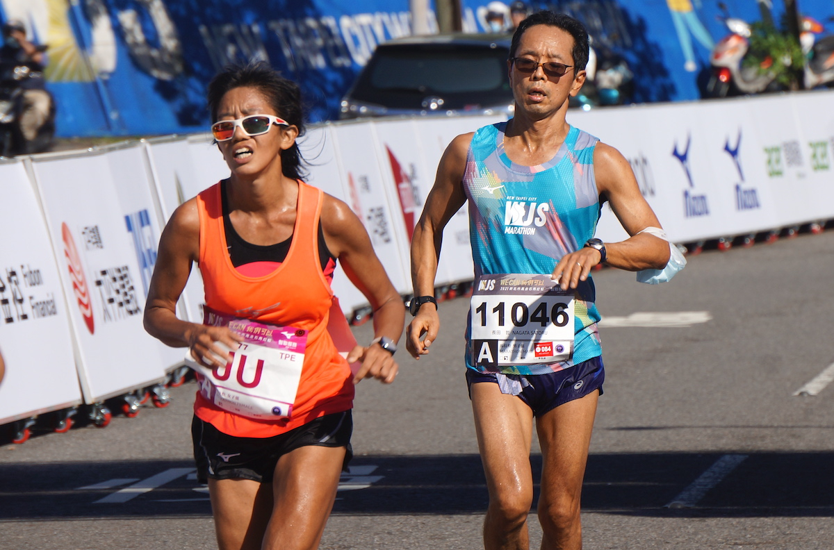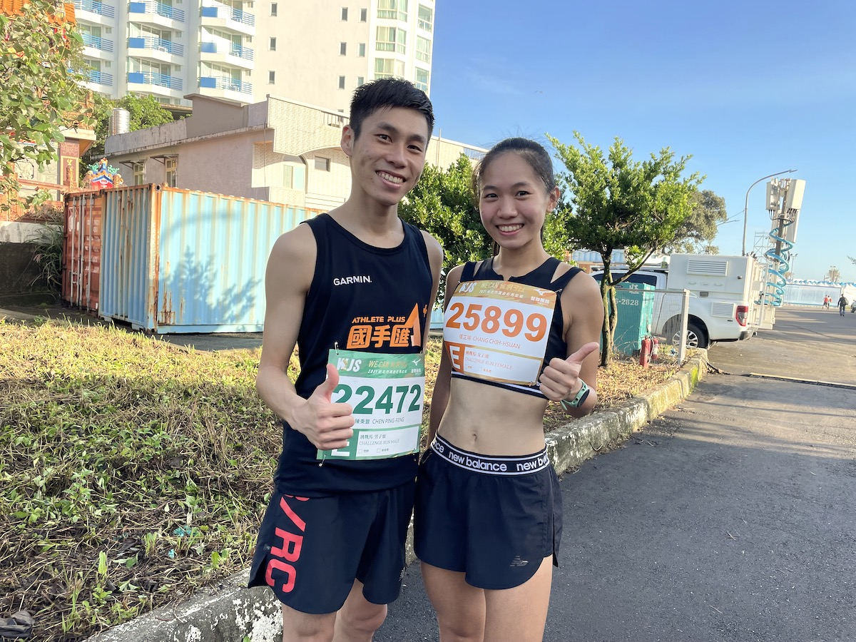 以賽代訓的「長跑甜心」張芷瑄(右)在 10K 挑戰馬女子組拿下第二;教練 陳秉豐(左)在男子組拿到第七