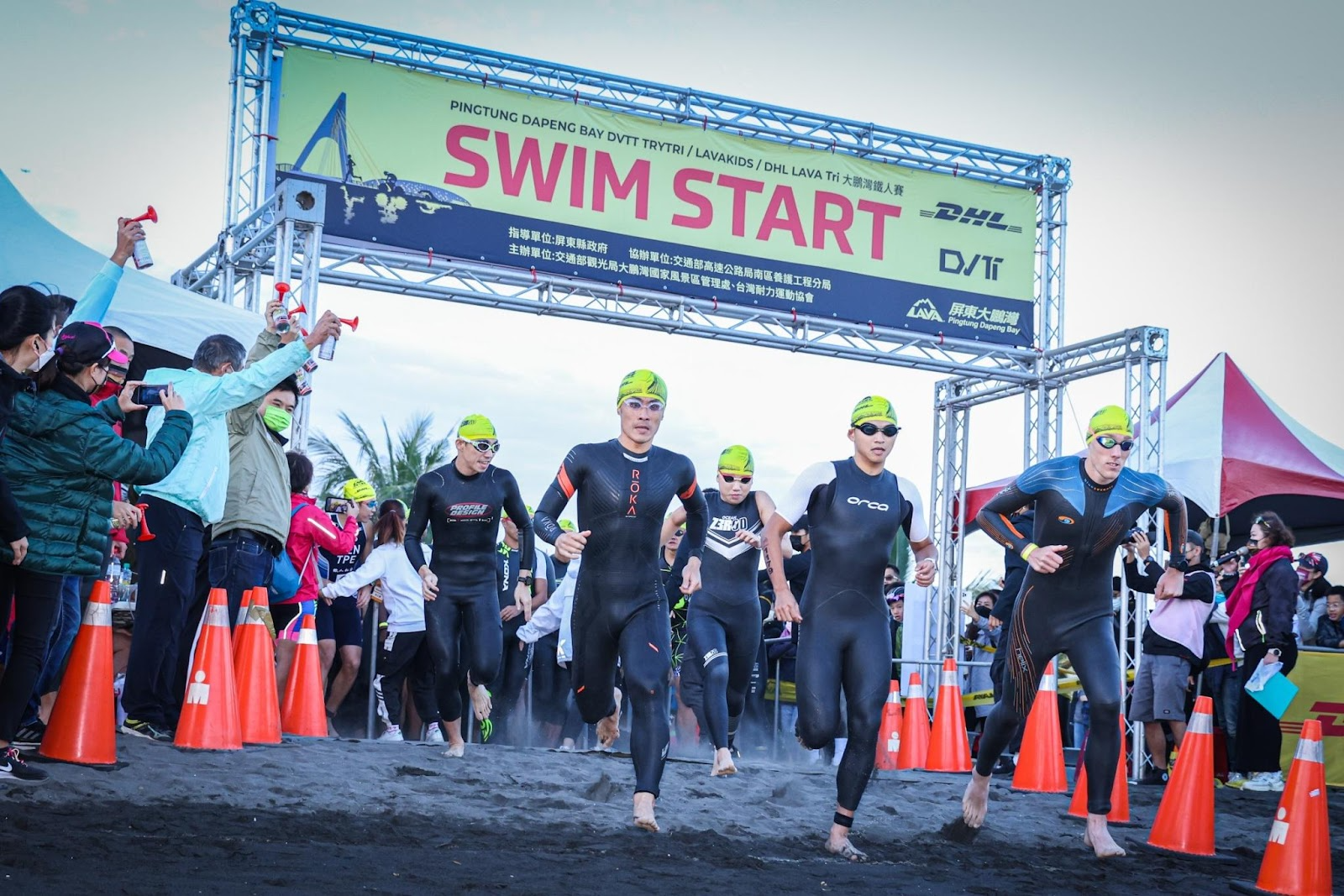 「2021 DHL LAVA TRI 鐵人賽大鵬灣站」於 12 月 04-05 日假屏東東港大鵬灣舉辦,今年第八年舉辦的賽事共吸引 1,500 多名來自 16 個國家的選手報名參加。今日(5)清晨選手聚集在大鵬灣帆船基地沙灘處,在立法委員莊瑞雄委員、交通部觀光局大鵬灣國家風景區管理處郭進慶秘書、交通部觀光局大鵬灣國家風景區管理處蔡昌悅課長、立法委員莊瑞雄辦公室特別助理黃禎祥、崎峰社區發展協會甘景勻總幹事、DHL 國際快遞台灣總經理黃湧君、LAVA 台灣鐵人公司董事長林澤浩,共同鳴笛下六點五十分準時開賽。