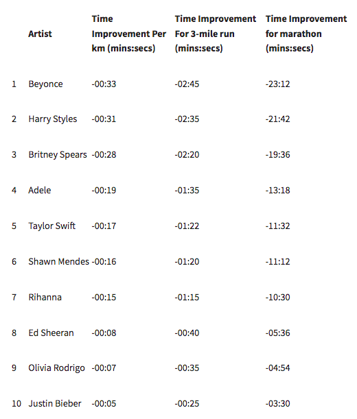 讓人沒想到獲得冠軍竟然是「Queen B」Beyoncé ,研究人員發現 Beyoncé 的音樂足以鼓舞人心,可以將跑者個人最佳成績每公里縮短 33 秒之多!Beyoncé 獲得 22 首熱門歌曲,其中諸如《Put A Ring On It》、《Run The World (Girls)》等歌曲,足以證明 Beyoncé 的高人氣與她歌聲的鼓舞是非常有效的。