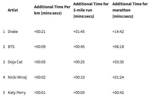 而有些人可能對這個結果也會感到意外,那就是來自加拿大的饒舌歌手 Drake ,這位在音樂串流平台 Spotifi 有著超過 280 億次的點聽率,然而他卻對你的跑步有著負面的影響,讓受測者每公里增加了 21 秒的時間。接下來依序是韓國 K pop 的防彈少年團 BTS 、 美國饒舌歌手 Doja Cat 等