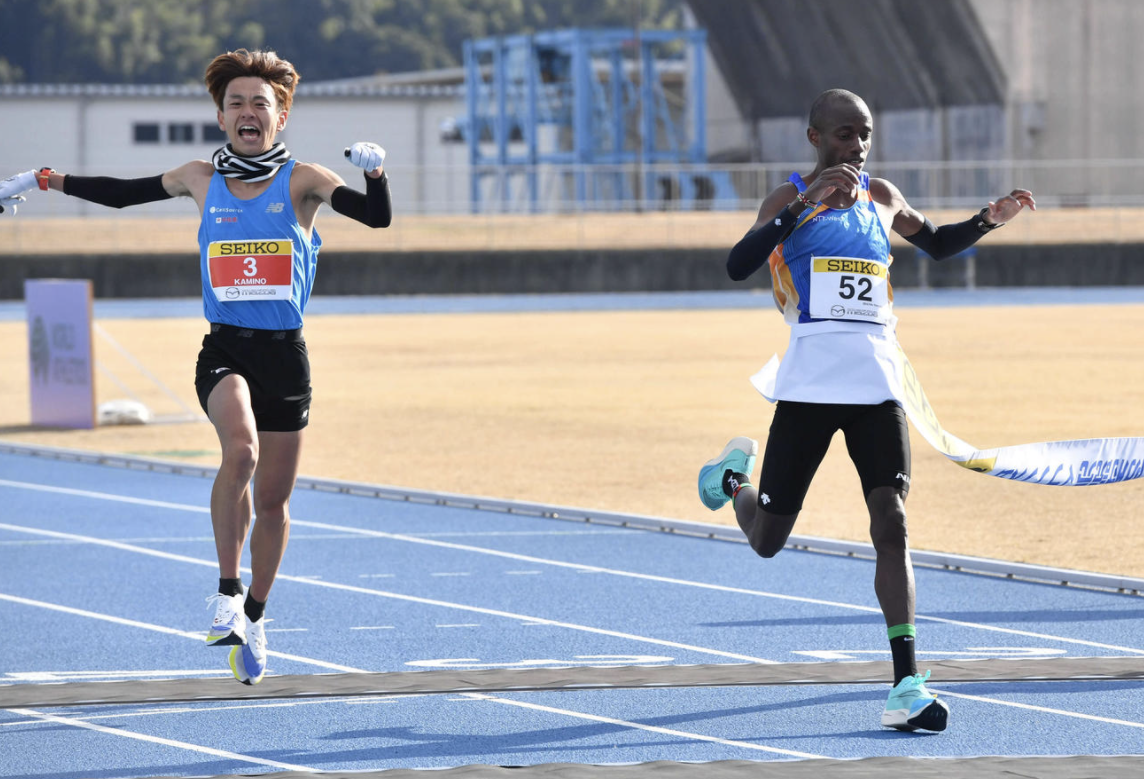 神野大地(左) 以些微之差落敗參加人生初馬的 Dominic Nyairo(右)