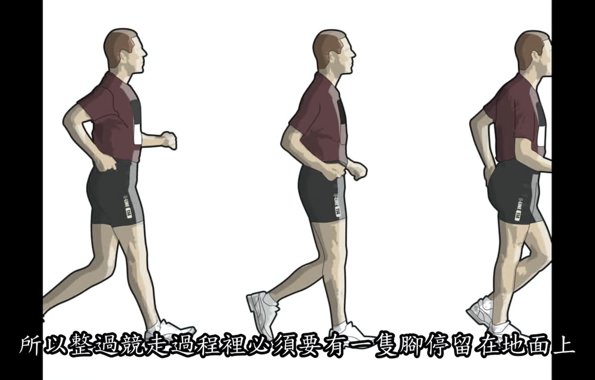 在介紹這位神人前,我先簡單介紹一下競走的規則。為了確定選手在過程中保持走路的動作,所以競走設立了 2 個規則來防止選手犯規。第一個是「騰空」,騰空的意思是指離開地面的狀態,在競走裡就是全程只可以有一隻腳離開地面,所以整過競走過程裡必須要有一隻腳停留在地面上。