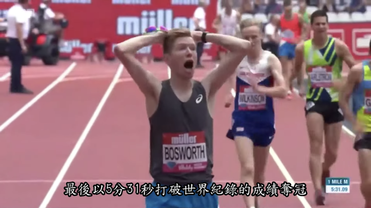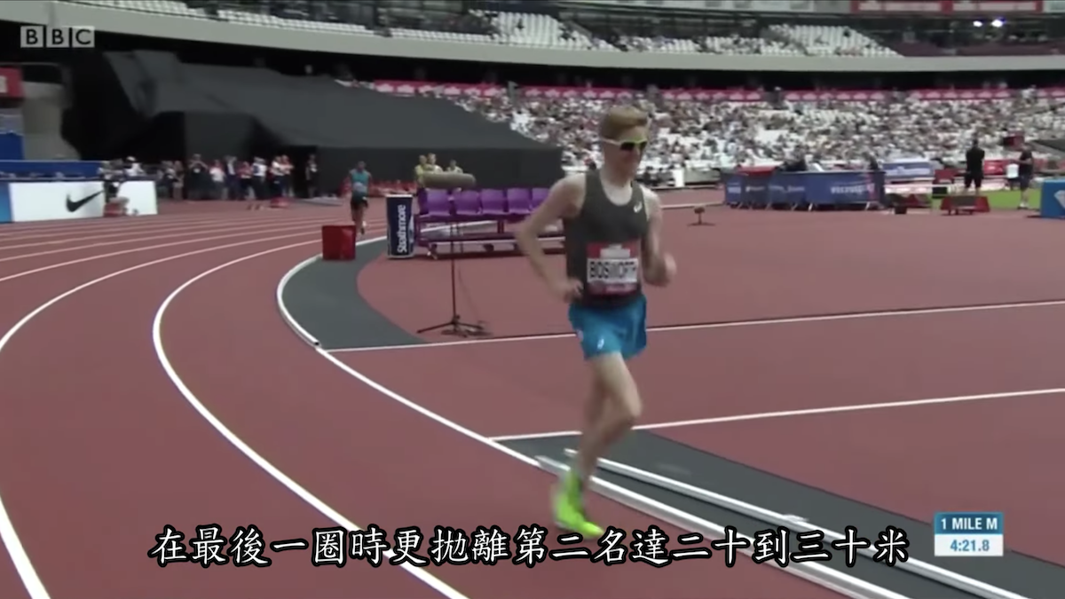 首先是 1 英里的競走,這場是 2017 年倫敦鑽石聯賽,比賽前段由 Bosworth 的隊友領跑,以 40 秒通過前兩百公尺,以 82 秒通過第一圈,在 500 多公尺時 Bosworth 出來「領走」,在約 800 公尺時已明顯拋離身後的對手,之後更越拉越遠,只剩下他與時間競賽,在最後一圈時更拋離第二名達 20 到 30 公尺,要注意這僅是 1.6 公里的比賽,但卻拋離這麼遠,真的相當誇張!