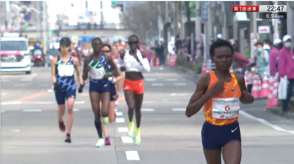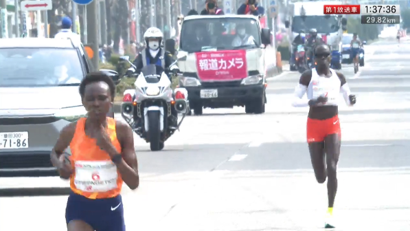 第一個 5 公里以 16:34 通過後,Chepngetich 超越配速員,一路獨跑到 30 公里;在後頭追趕的 3 人有 安藤有香、在2020 東京馬拿下女子冠軍的以色列選手 Lonah Chemtai Salpeter,以及有野心的 2:26 日本選手 細田愛。細田愛在 20 公里前便掉速,此時 Chepngetich 約有 49 秒的領先優勢。