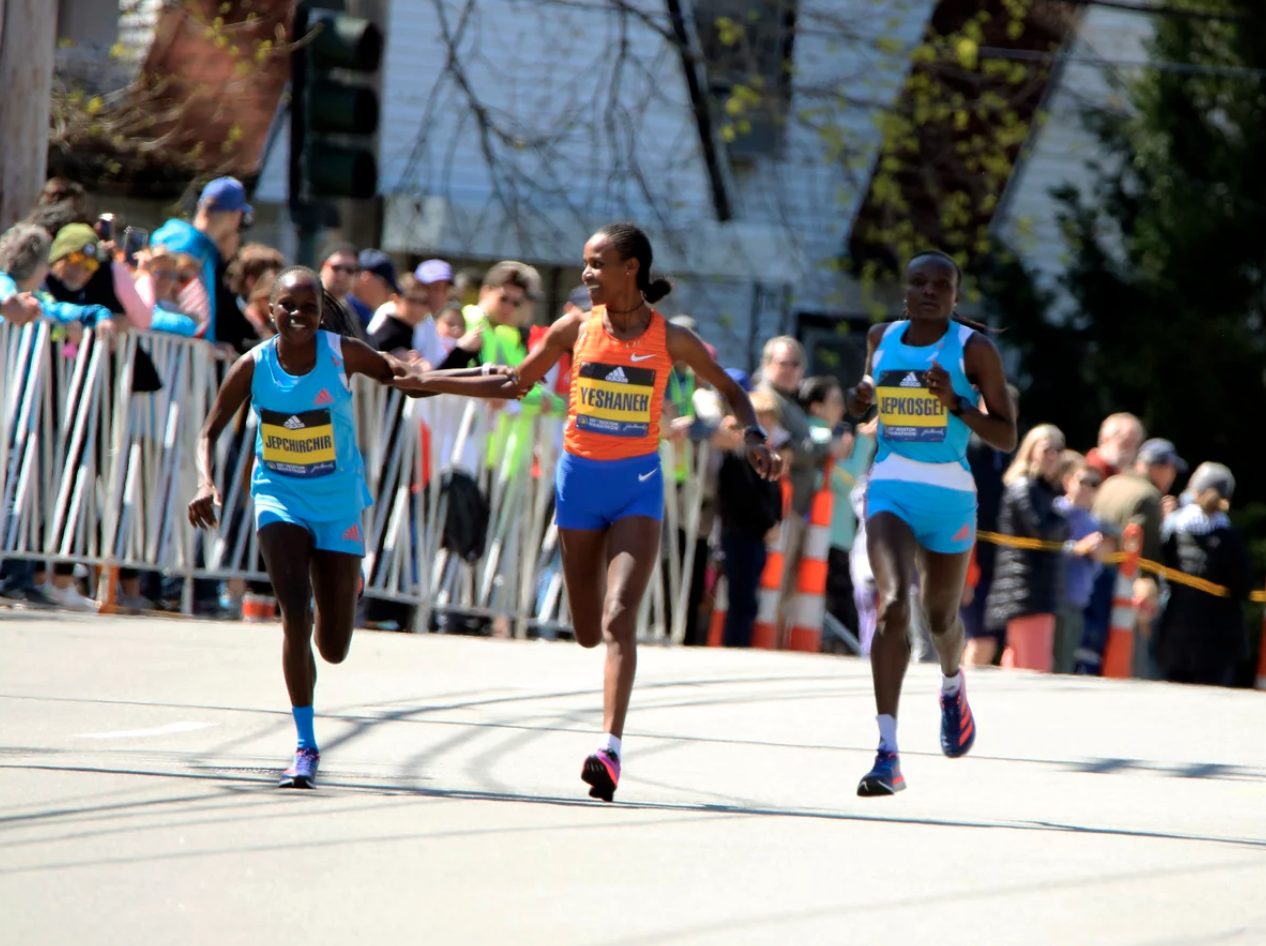 肯亞 Peres Jepchirchir(左)和衣索比亞 Ababel Yeshaneh 互有領先,最後 Jepchirchir 贏得女子組冠軍,Yeshaneh 獲得第二名。最右邊是肯亞的 Joyciline Jeopkosgei。圖/NPR