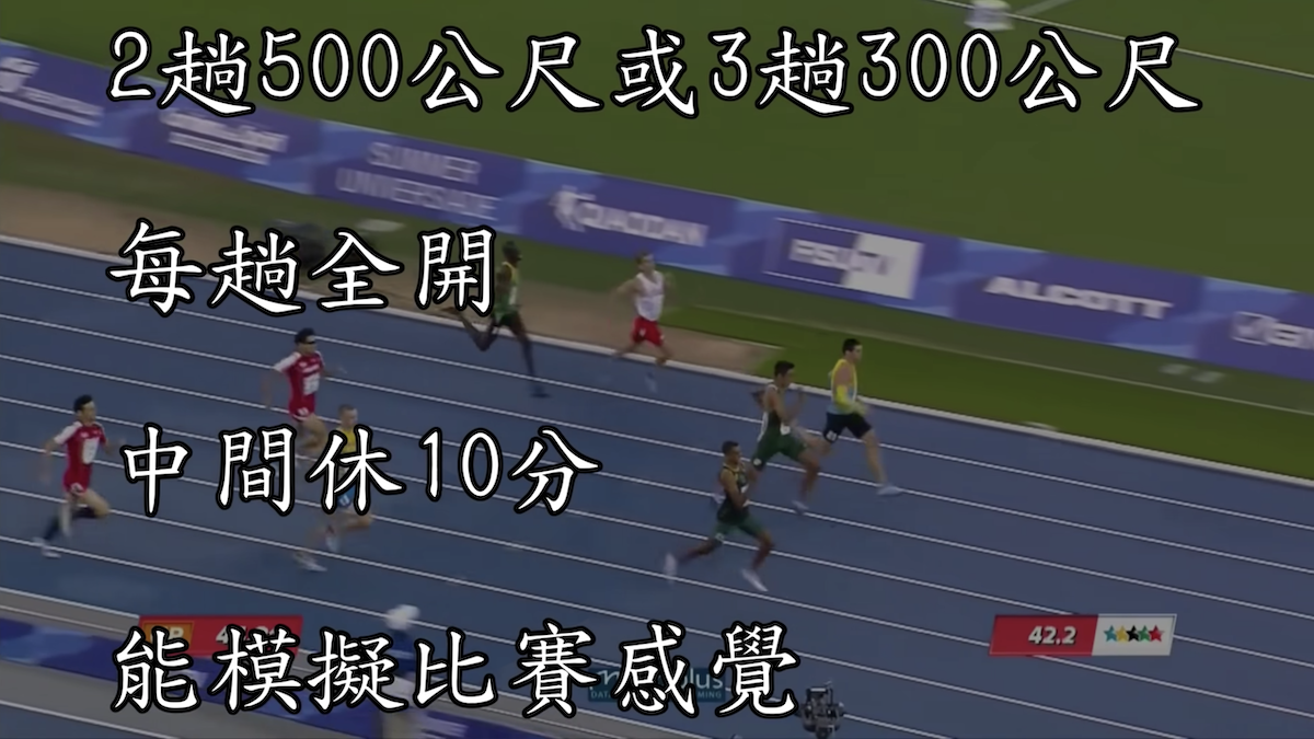 到達 200 公尺時要加一點速,因為疲勞感已經蠻高了,如果不加速的話,後面 200 公尺會掉速得很厲害;到達 300 公尺時,基本上腿會酸到快要跌倒,至於酸的程度有多誇張呢?就是連世界級選手都會爆掉像慢跑一樣,甚至直接倒下。