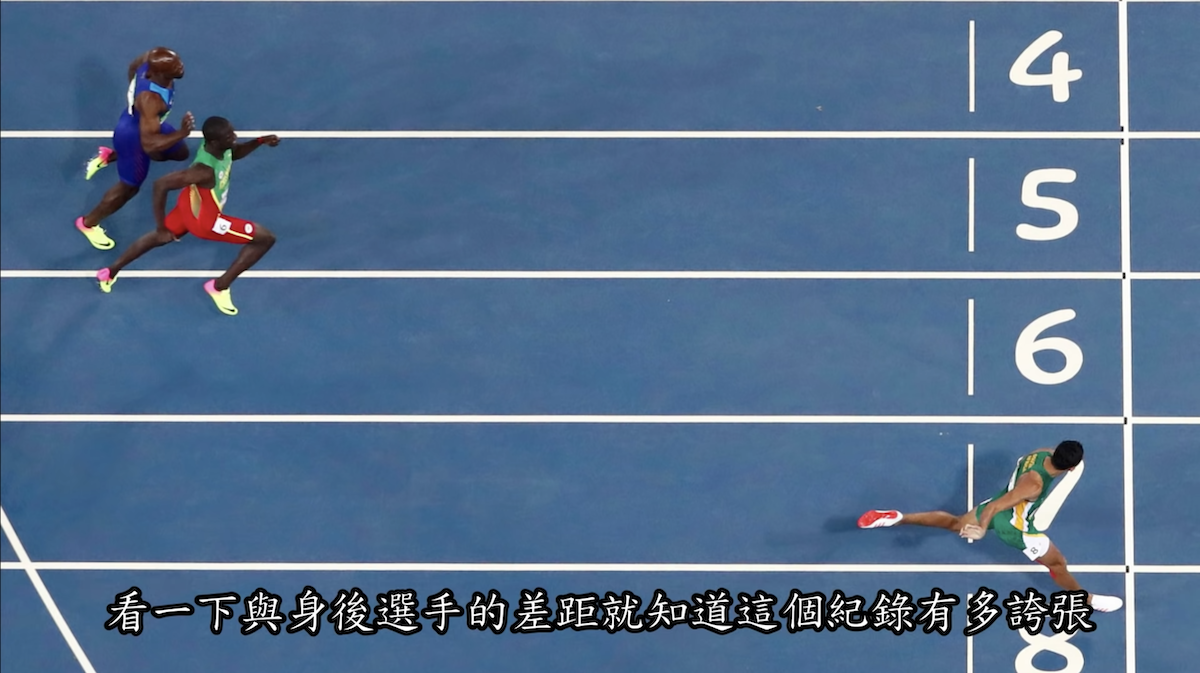 在破世界紀錄的那一場比賽中, Van Niekerk 先以 10 秒 70 通過前 100 公尺,20 秒 50 通過 200 公尺,此時已完全拋離身後的選手;到達 300 公尺時是 31 秒整!這個時間有多誇張呢?當時 300 公尺世界紀錄已經是 30 秒 85(由 Michael Johnson 所創)。