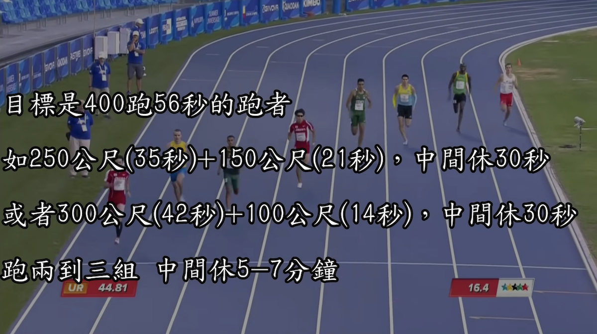 如果你的目標是 56 秒跑完 400 公尺,那 250 公尺就要跑 35 秒、150 公尺要跑 21 秒;300 加 100 公尺的 300 公尺則是以 42 秒跑完、100 公尺以 14 秒跑完。