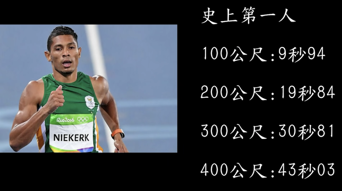 Van Niekerk 是史上第一個 100、200、300、400 公尺能在10 秒、20 秒、31 秒及 44 秒內完成的人!