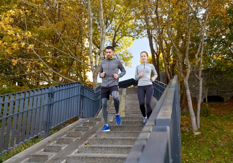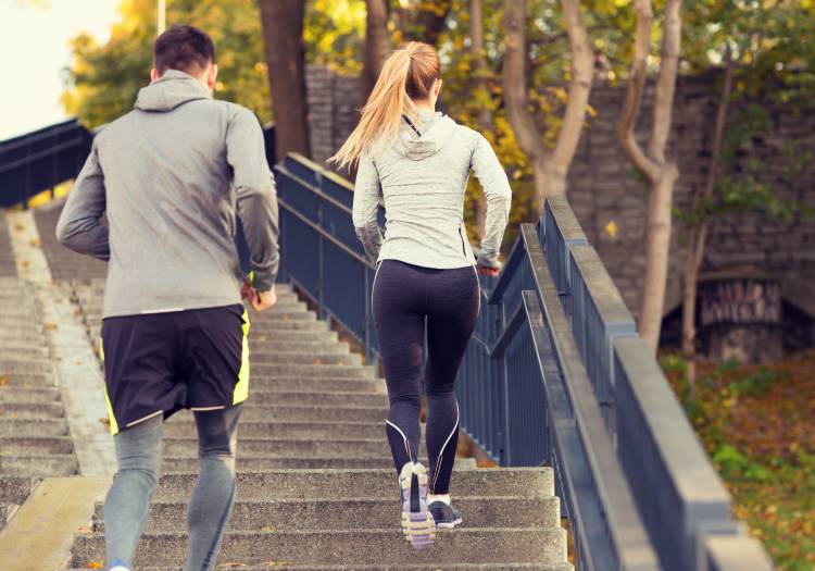 上階梯時,若是很平整的階梯,兩腳踏步要往前成一貫性,保持肌肉形態在正前方,身體核心成一直線前進。若遇到愈陡的階梯,前傾的角度要愈大,在地面不會滑的情況,用前腳掌三分之二和階梯面接觸,輕快拾階而上即可。越野跑中常見的跨步側踏是運用在不規則階梯不平整面,若在平整階上使用,四頭肌形態會跑掉,反而消耗更多體力。