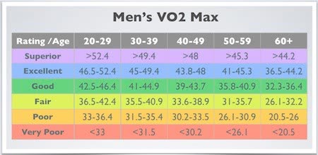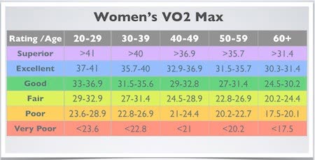 而人類的VO₂max值從心臟病患者約 10ml/kg/min 到世界級耐力運動員接近 90ml/kg/min 的水準,不同年齡的男性、女性的平均值也已經被用來建立心肺體適能量表,而通常心肺體適能水準也會隨著年齡增加而下降。