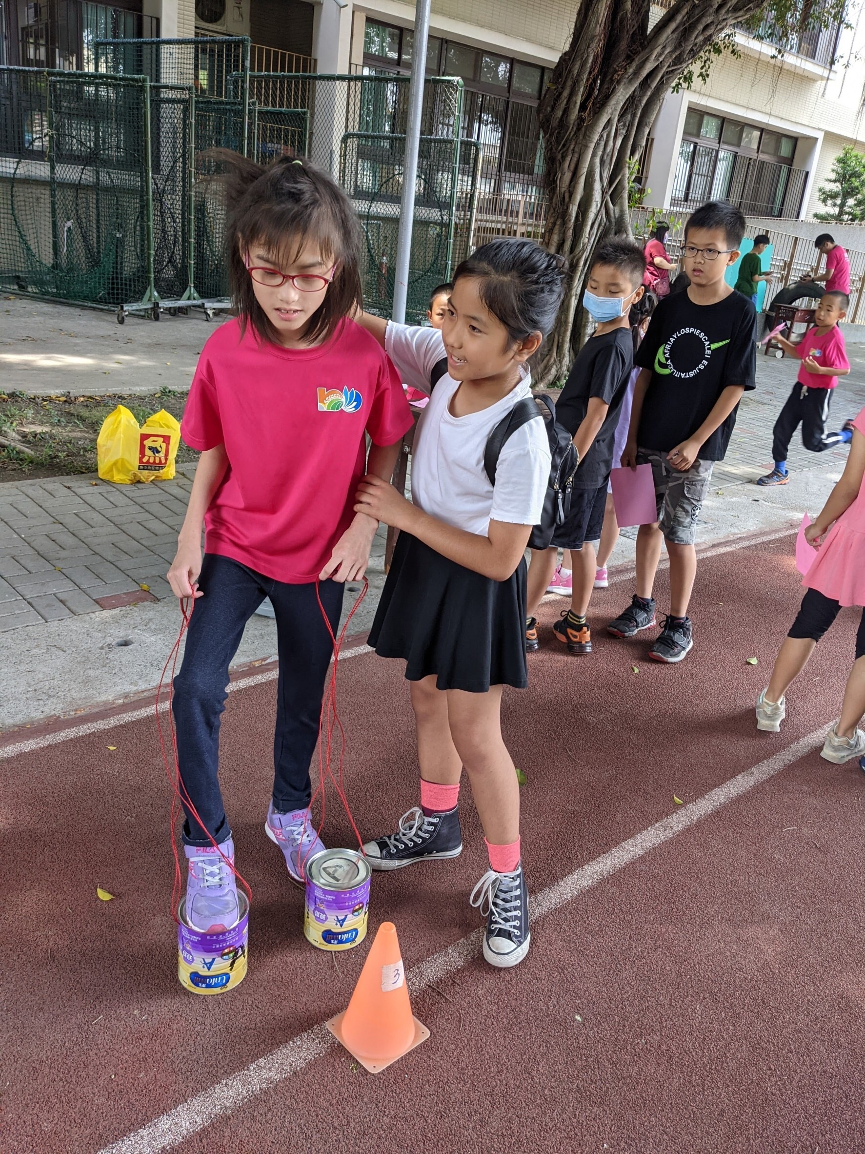 由於身體與心理層面的與眾不同,上體育課的過程中,同儕的陪伴與老師的協助皆是不可或缺的元素。以躲避飛盤為例,老師會安排宜津守在較少跑動的外場,並引導隊員適時傳遞飛盤,透過老師的控場與同儕的支援,讓她也能參與其中,共享體育課的樂趣。體育課的內容多元豐富,從足球、跳繩、跑步,到飛盤、陀螺、籃球都難不倒宜津,雖然速度較慢且有時會跟不太上,但有同儕以及教師從旁示範與指出錯誤動作,總會找到適合自己的方式一起運動。