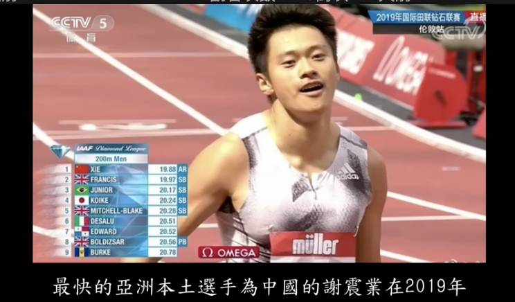 除了這個例子外,在 2019 年的鑽石聯賽 200 公尺上中國選手謝震業也創下了一個輝煌的成就,在這場比賽上除了謝震業外還有一位亞洲本土選手,日本的小池祐貴,儘管謝震業在最外道的不利條件下進行比賽,但似乎沒有影響他的發揮,之後更越跑越順暢,以 19 秒 88 打破了亞洲紀錄,並且是歷史性的在鑽石聯賽上奪金。