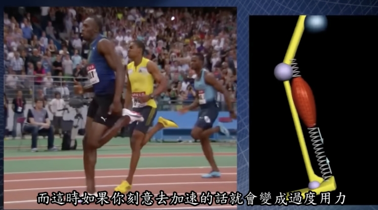 此外,短跑比賽有一個很有趣的地方是,你越用力跑反而會跑越慢,越放鬆去跑反而跑越快。這其實是因為人的跟腱在落地後回彈起來時本身已經有一股力量來推動腳去前進,而這時如果你刻意去加速的話就會變成過度用力,這反而會阻礙跟腱發力,損耗更多的體力。