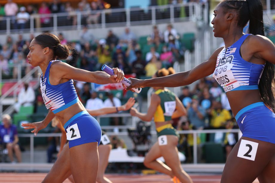 首棒是今年才 19 歲 Talitha Diggs,他是 NCAA 400m 冠軍,而她的母親是美國田徑名將 Joetta Clark,也是 Jearl Miles Clark 的姪女,她曾在世錦賽中贏得三次 4x400 接力金牌,Diggs 承接著兩位的期待站上了舞台,繳出了不錯的開場 50.50 ,以 0.09 些微優勢將棒子交給了第二棒 Abby Steiner,Steiner 以 49.99 的區段成績幫助美國隊繼續維持領先的優勢,隨後棒次傳給了 Britton Wilson 她也繳出 49.39 ,帶著 0.73 巨大優勢將棒子傳給了 Sydney McLaughlin!
