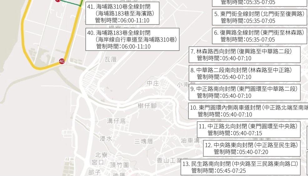 (3)中山路(中正路至北門街)管制時間:05:35-07:05。