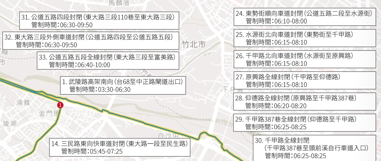 (30)千甲路(千甲路387巷至頭前溪自行車道入口)管制時間:06:25-08:25。