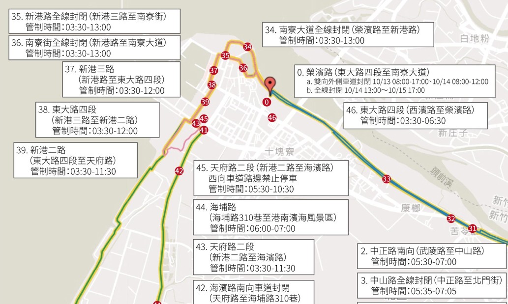 為維持賽事順暢圓滿進行,10/13起因前置作業,部份路段交通管制;當日上午3:30至下午1:00將分路段、分時段進行交通路線管制,力求降低交通影響,請用路人注意交通管制相關資訊,確保用路權益,造成不便之處,敬請見諒。管制資訊說明如下: