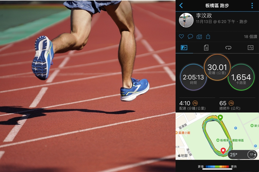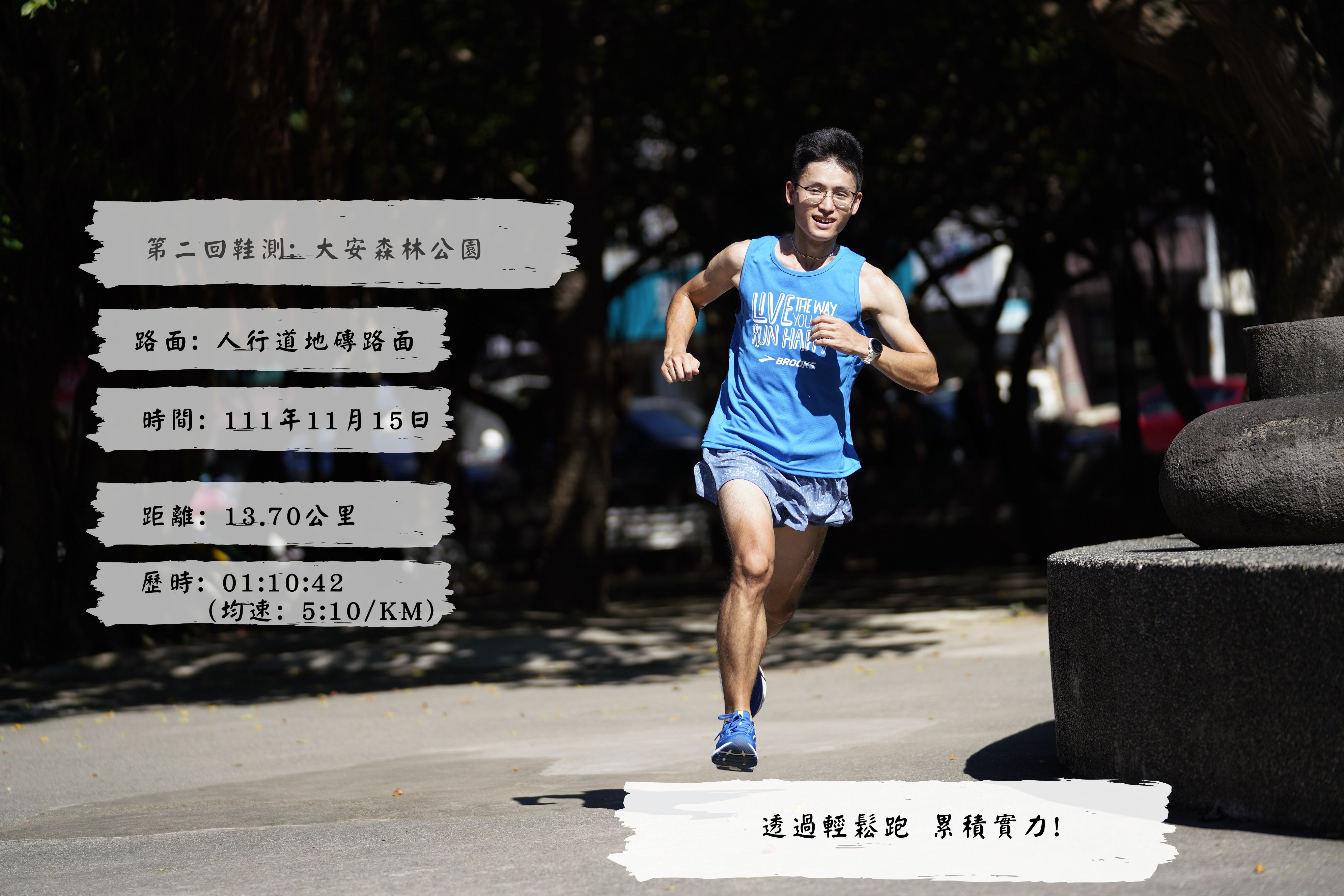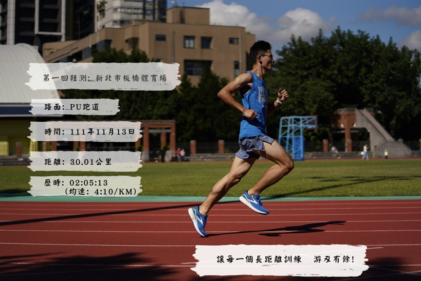第一個測試地點是板橋第一運動場,當天測試長距離 30.01 公里,平均配速 4 分 10 秒,總時長為 2 小時 5 分 13 秒。