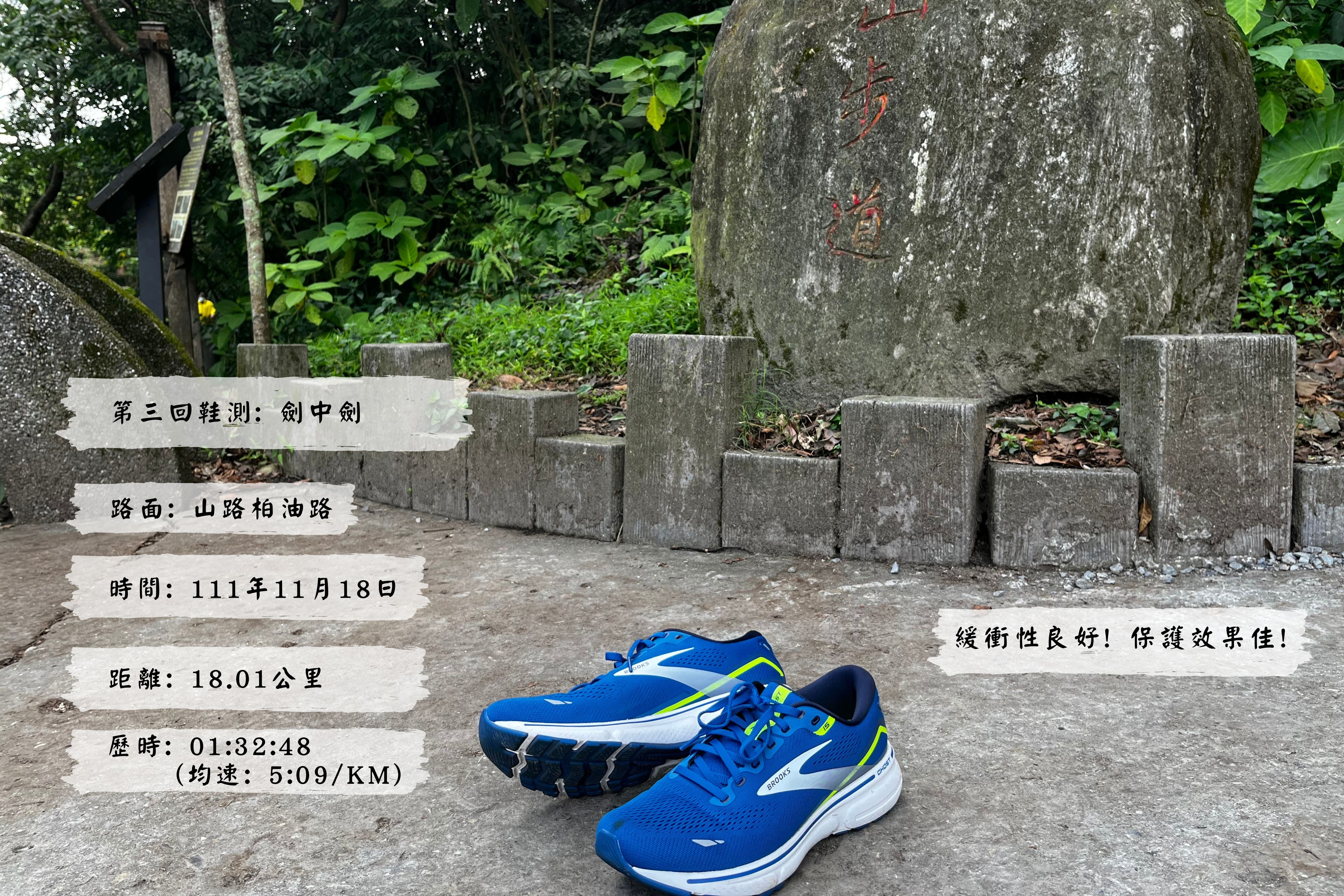 第三次測試我選了劍中劍的山坡地來進行,測試前我對 BROOKS GHOST 15 有預期的測試要點:抓地力及下坡加速時的緩衝性,當我用 1 小時 32 分的時間跑完山路,確實可以安心的說:下坡的緩衝性真的不錯,回程下坡時我整段都沒有刻意減速,跑完之後也沒有任何不適,也許 GHOST 15 就是有種魔力,要輕鬆跑、要跑山都可以搞定。