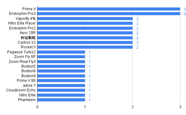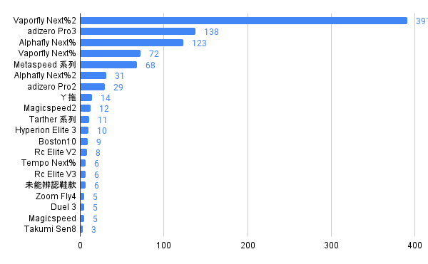在鞋款方,NIKE 依舊以強大的實力在前五名鞋款中攻佔三個名次,以 Vaporfly Next%2 以 391 雙居冠!而 Alphafly Next% 也擁有 123 雙,Vaporfly Next% 亦提供 72 雙的火力支援;adidas 的 adizero Pro3 以 138 雙拿下第二名,而 ASICS 的 Metaspeed 系列統合計算後也擁有 68 雙,Magicspeed2 也相當受到跑者歡迎有著 12 雙的表現,包括在厚底鞋起飛前最熱門的薄底跑鞋-虎走系列在本次也仍有 11 雙愛好者選用。