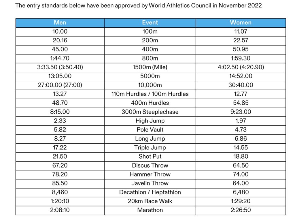 對於所有的運動員來說,此次的參賽標準應該是有史以來最具挑戰性的,世界田徑總會的目標是希望能夠讓 50% 的參賽者達標參賽資格,剩下的再由世界排名來做決定,在今年 8 月所公布的 2023 布達佩斯世錦賽的參賽資格也是相當的嚴格,幾乎與奧運標準無異,僅有一個例外-馬拉松。