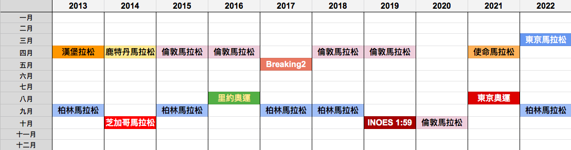 Kipchoge 自 2013 參加馬拉松賽事一覽: