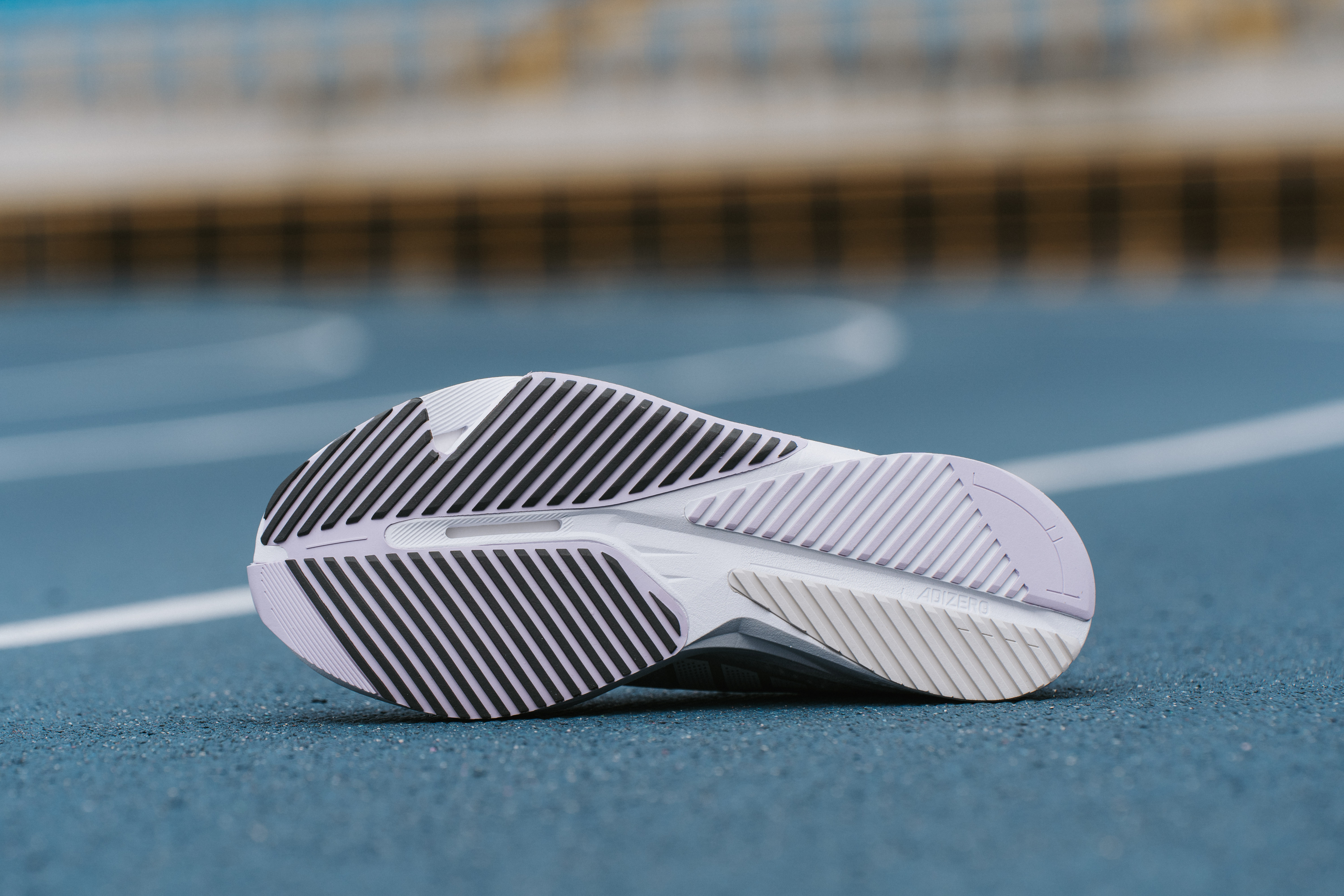 再來先略過中底(精彩的總是要留到最後),將鞋子翻面來看,它的大底是採用橡膠大底,同樣以丁香紫為襯底搭上黑色的斜線條,抓地力非常的足夠,而且仔細一看,可以發現在鞋底還有一個亮點,它的前掌外側特別仿造 ADIZERO Adios Pro 3 以凹槽切割處理,除了能減輕鞋身重量之外,更可引導跑者向前,幫助前掌落地跑者的步態更趨自然,單腳鞋重僅為 241g ,整體上腳相當的輕巧,不會感受到鞋子的重量。