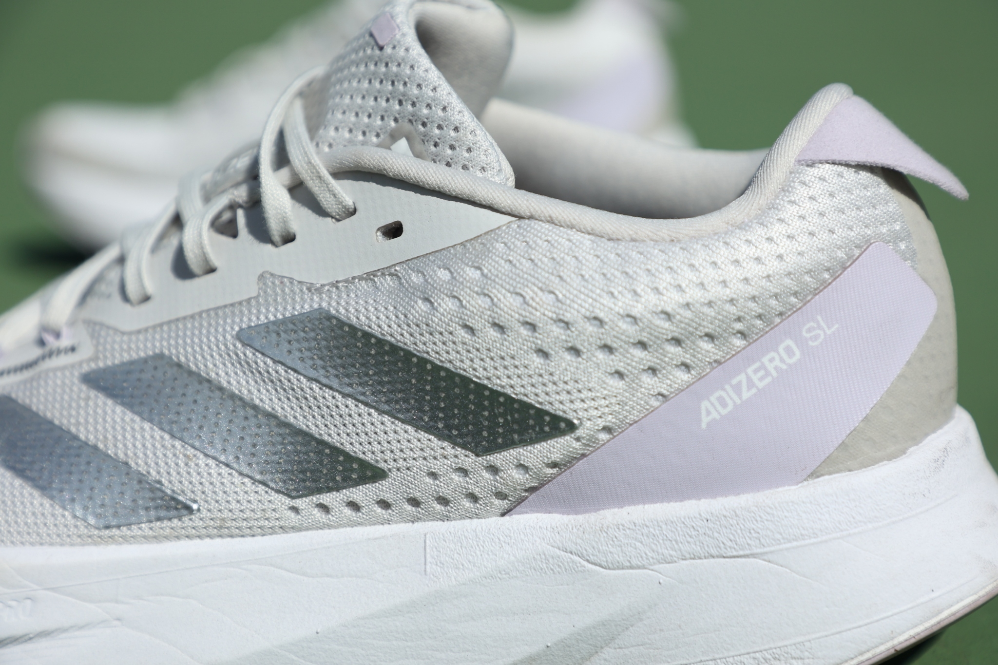 ADIZERO SL 女款是比較低調的設計,以淡灰色為主體,外側則是搭上銀色 LOGO ,雖然簡單但它一點都不簡單,看似低調的設計,其實在後方的兩側及鞋提和鞋頭都加入了女孩最愛的浪漫丁香紫元素,讓整雙鞋宛如畫龍點睛般炫亮了起來。