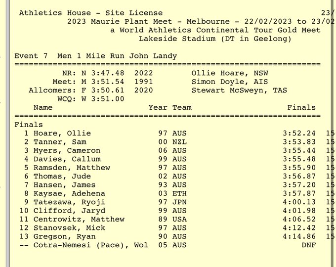 週四在澳洲墨爾本舉行的 2023 世界田徑巡迴金牌賽(World Athletics Continental Tour Gold)中,來自坎培拉(Canberra)的 16 歲學生 Cameron Myers 成為歷史第二年輕打破 4 分鐘一英里大關的人,他以 3:55.44 寫下新的 U16 世界紀錄。