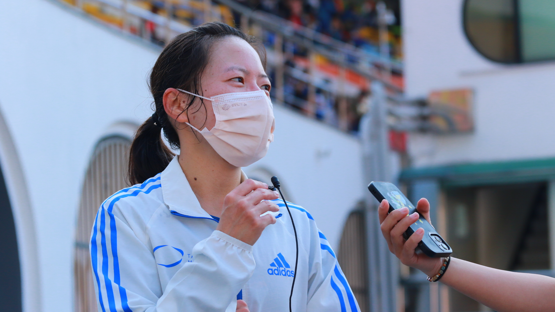 接受訪問的 于朕 第一句話就是感謝 吳敏學姊,她表示吳敏學姊前半程穩定的配速與破風,都讓她能夠在後面保有體力,能夠在最後幾圈跑出去;對於本場比賽的表現,于朕 則說算是出乎意料,有達到自己賽前的目標,她談到最近正在經歷低潮的狀態,雖然她說還沒有回復到個人最佳的狀態,但是有逐漸在慢慢恢復與進步,所以今天有達到目標,希望能夠讓自己再相信自己一些!