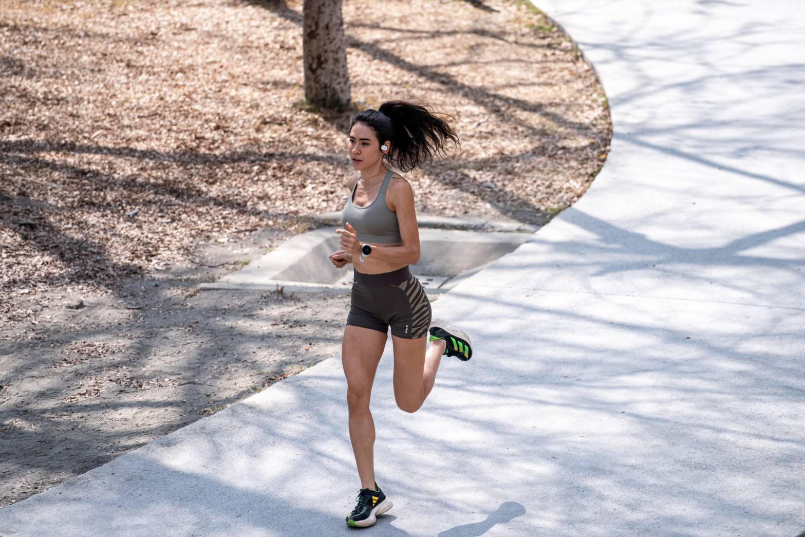 戴上 Sony Float Run 的瞬間也會有些不安:「這樣真的不會掉嗎?」但實際戴著試跑過後,她開始相信真的可以盡情地奔跑與跳動!反倒是先前戴過的入耳式耳機偶有掉出耳朵之虞⋯⋯