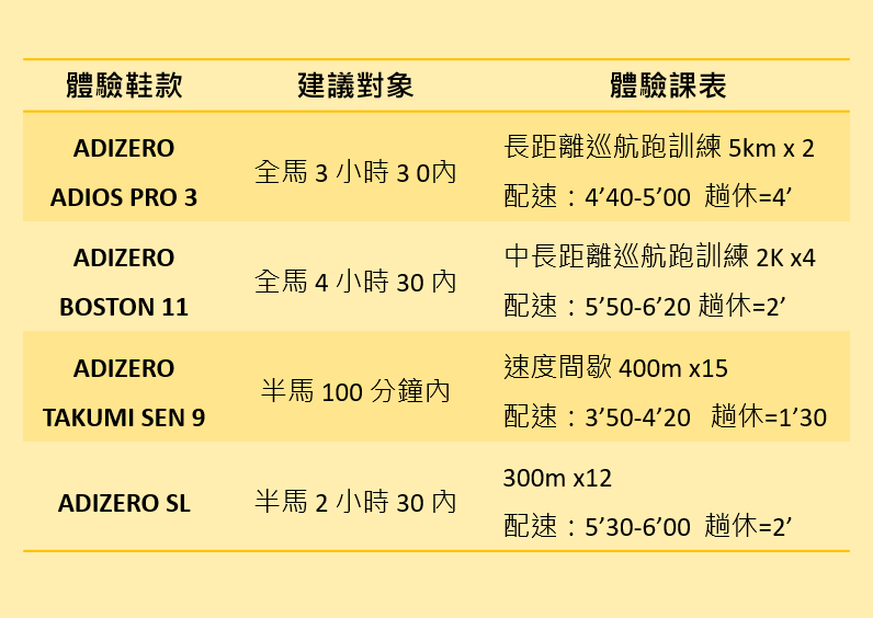 體驗會將於 4/15(六)、4/16(日)15:30-18:00 分別於台北內湖麥帥橋下(內湖端)、高雄鳳山運動場舉行,現場會依據不同鞋款的定位及特性安排體驗課表及配速,兩場活動將各招募 20 位跑友一同見證 adidas ADIZERO 家族的厲害及新色的美麗;每款鞋提供 5 個名額,跑友們在報名時務必確認自身的能力、合適的課表與鞋款,避免跑課表太吃力,享受不到鞋子鞋款的優異表現~