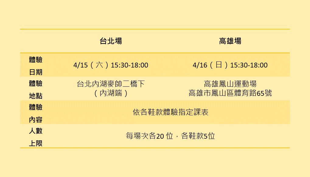 *小叮嚀:體驗者請勿穿含其他運動品牌 LOGO 的衣、褲、襪及相關配件
