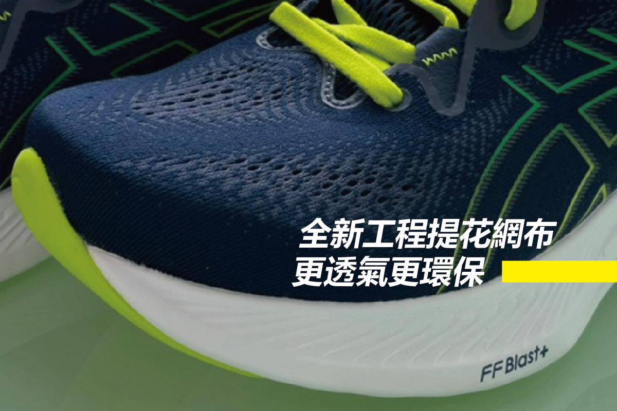 「全新工程提花網布」給予極佳透氣性,維持足部乾爽舒適,並在後跟杯位置增加了反光貼片,使你在夜晚中跑步能更安全,鞋面採用染色工藝製作,比一般染色工藝能有效減少用水量 33%,鞋面更有 75% 以回收材料製成,以此減少浪費與二氧化碳排放。