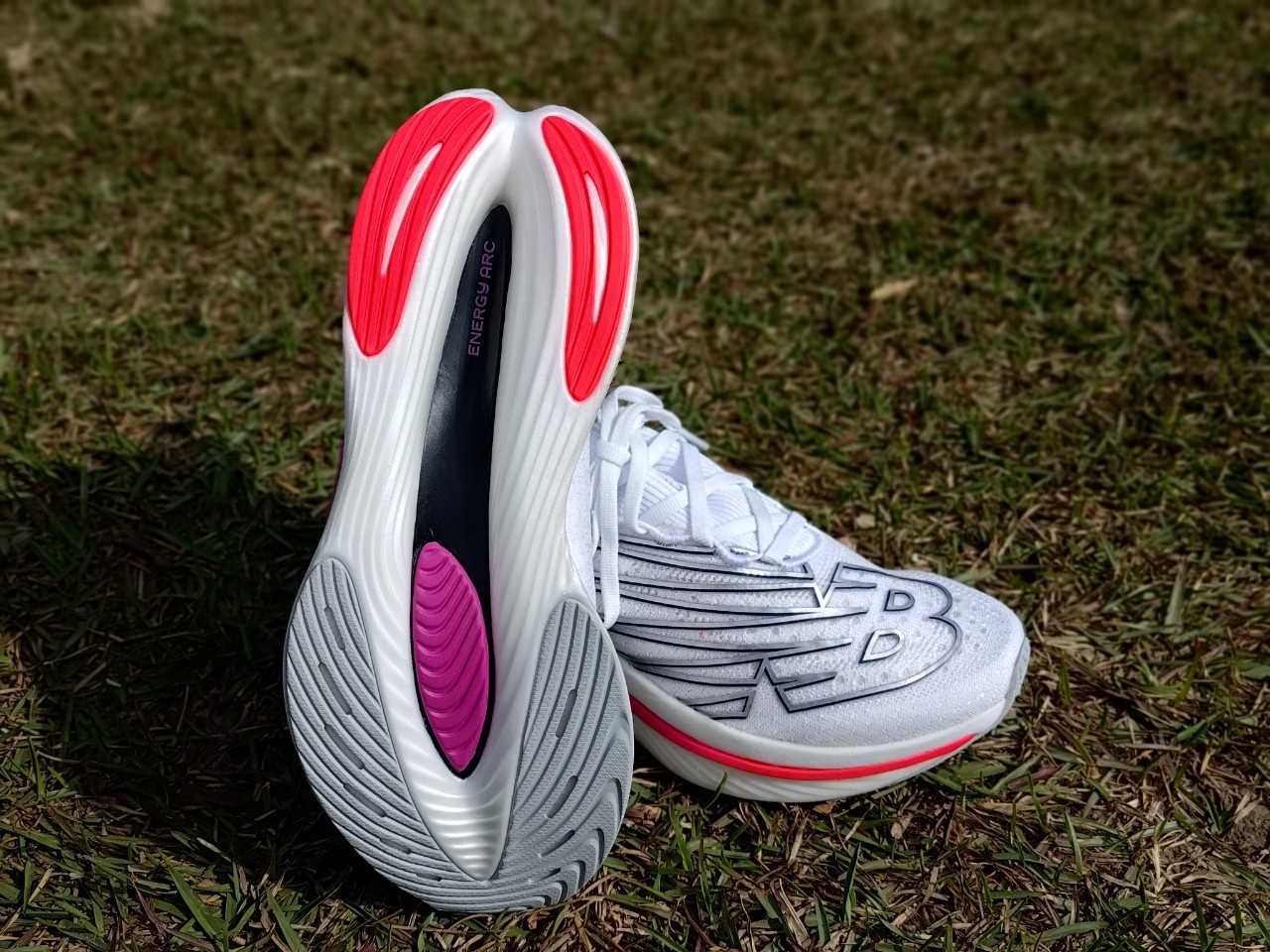 Energy Arc 科技是將碳纖維板夾於兩層 FuelCell 中底之間,並透過特殊造型(挖空)中底以達到儲存最多能量、提供最多回饋的作用。推蹬時,鞋底露出的凹槽及黑色碳板便是 Energy Arc 科技所在之處。